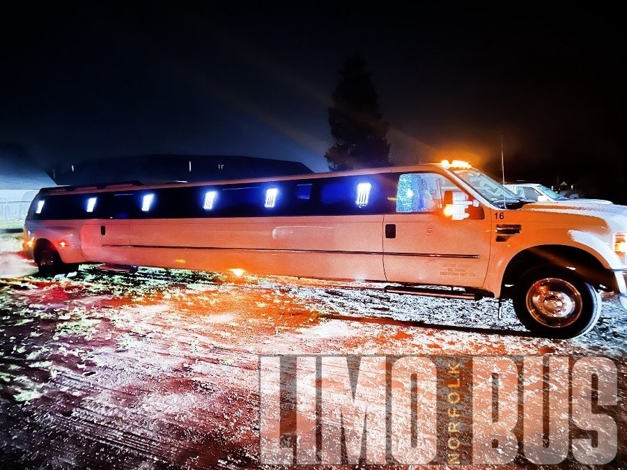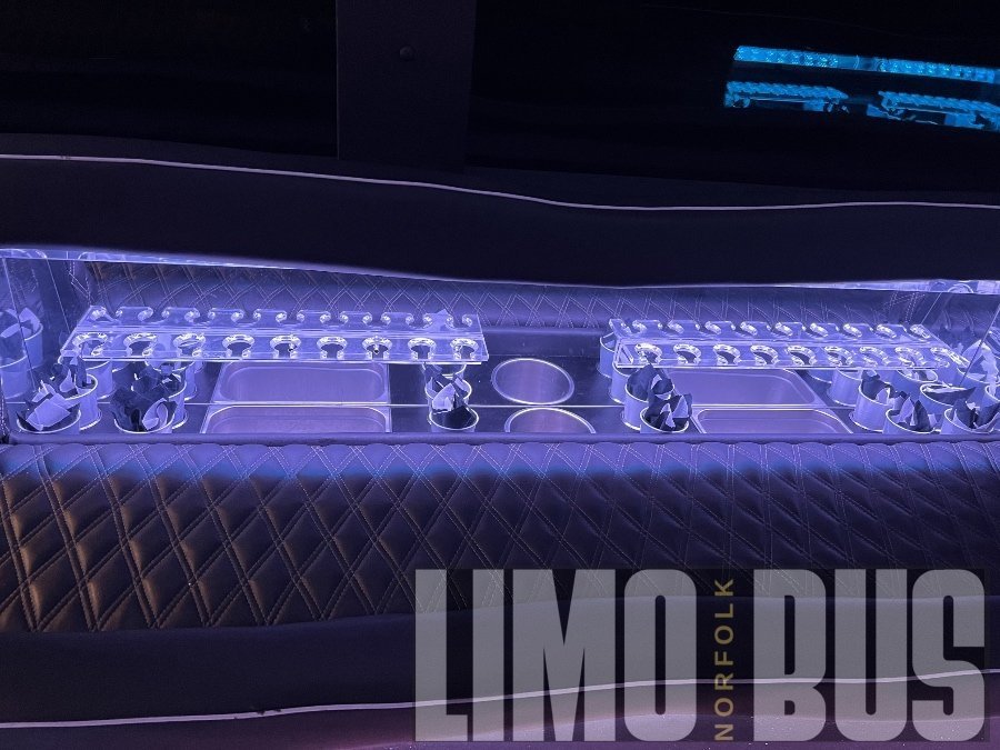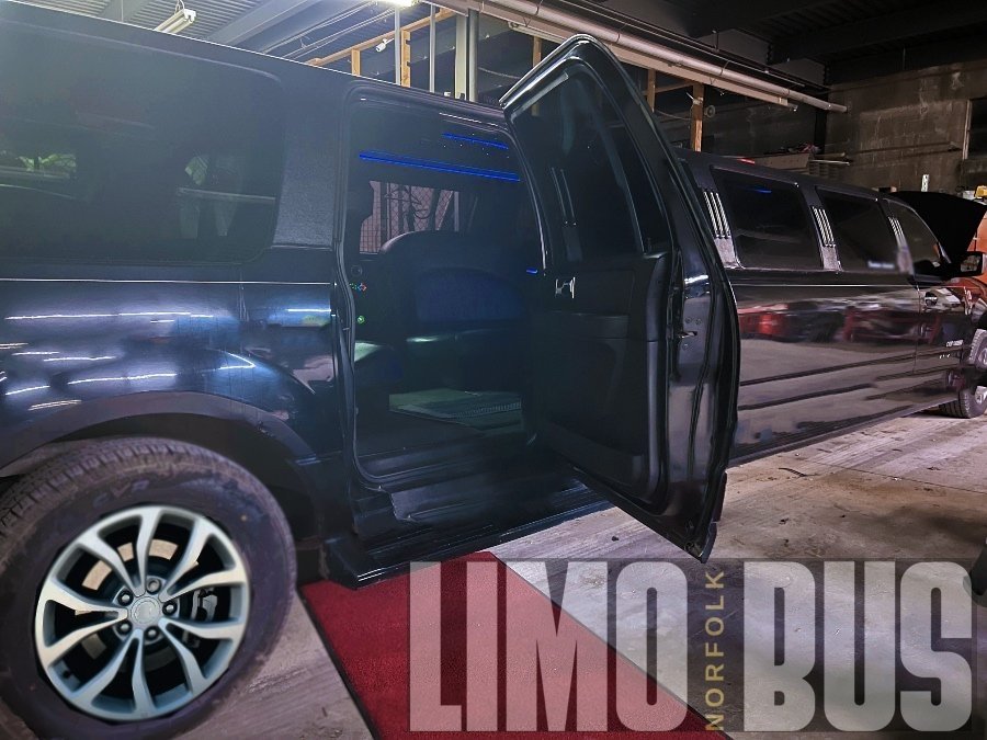 Experience ultimate luxury with our 22-passenger Ford F-750 stretch SUV limo in Norfolk. This impressive vehicle features premium two-tone leather seating, fiber optic ceiling lighting, dual crystal bar setups, and sleek mirrored panels for a dramatic, upscale feel. Whether it’s a wedding, prom, corporate event, or a night out, this stretch SUV limo offers powerful presence, dynamic LED lighting, premium surround sound, and spacious comfort — transforming every trip into a VIP celebration.