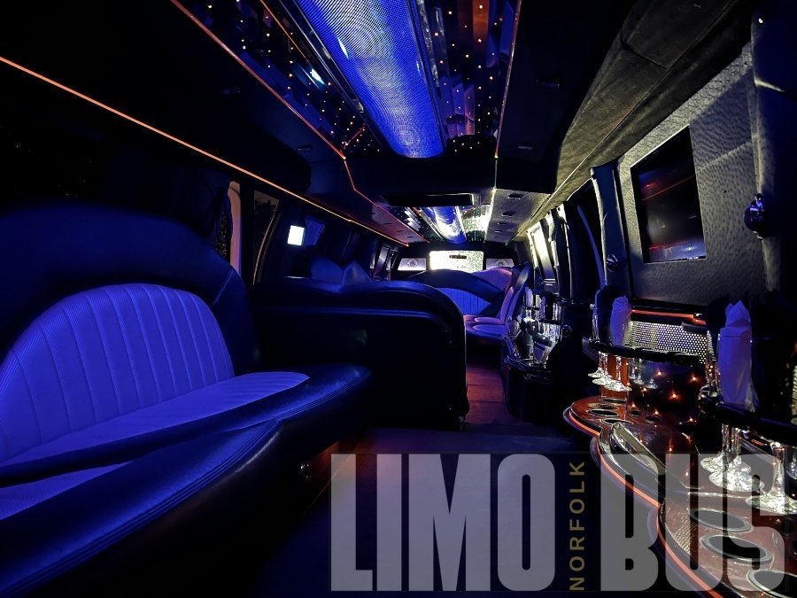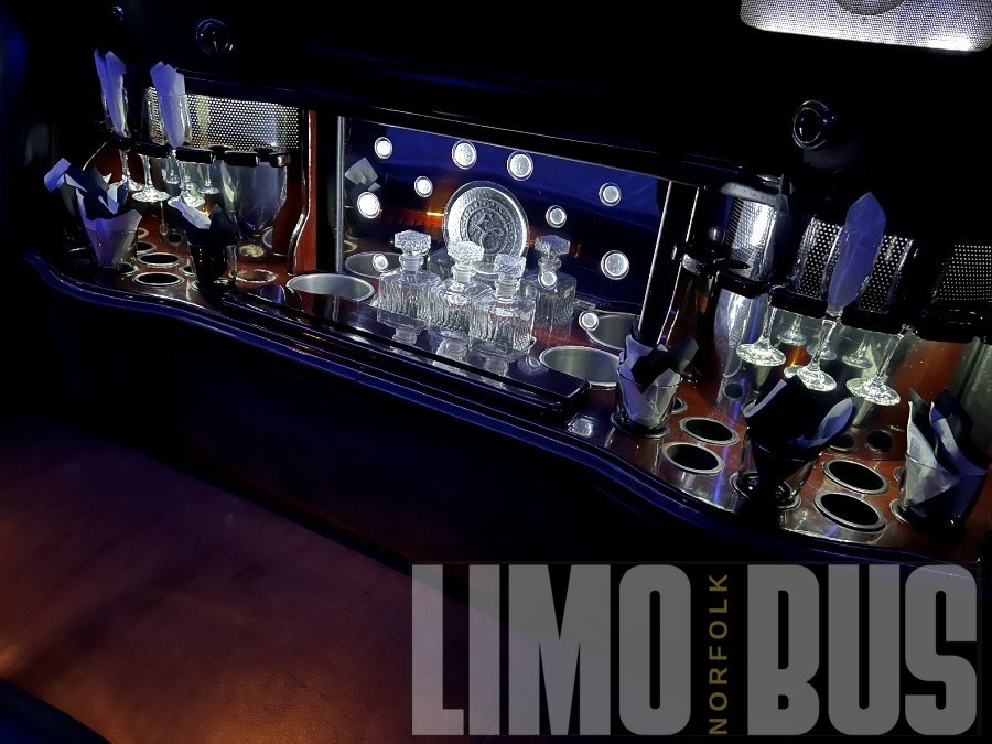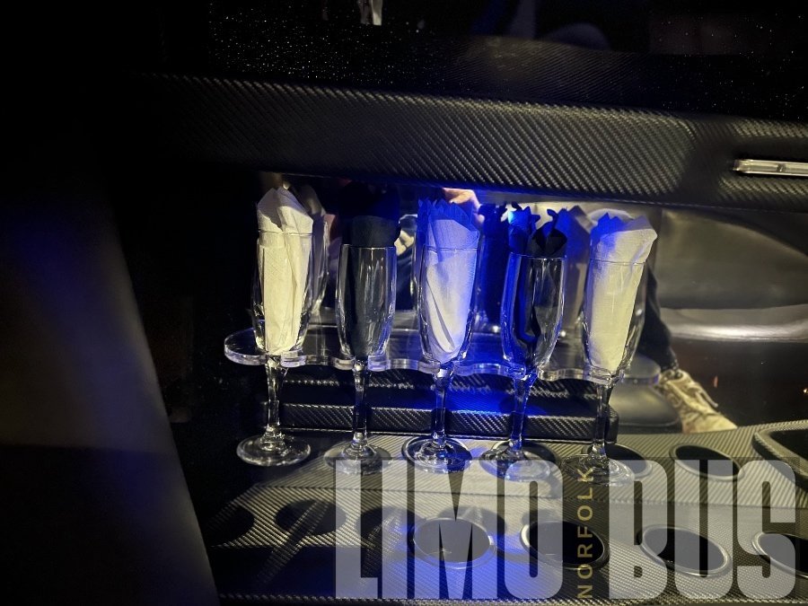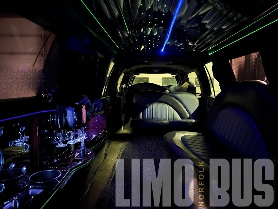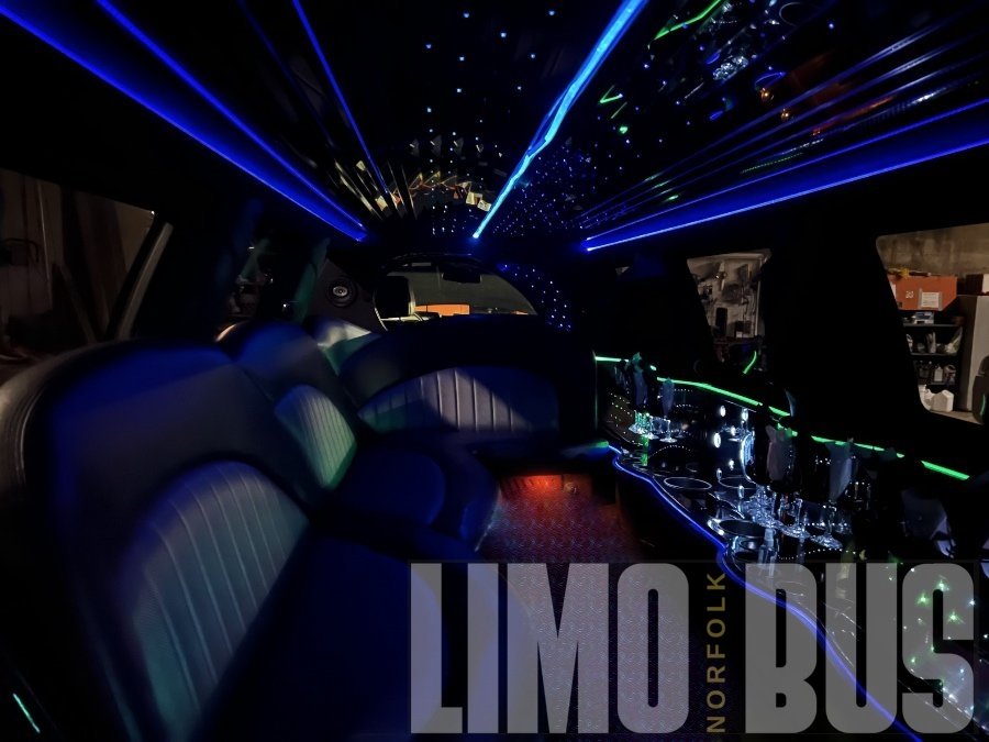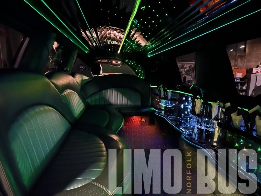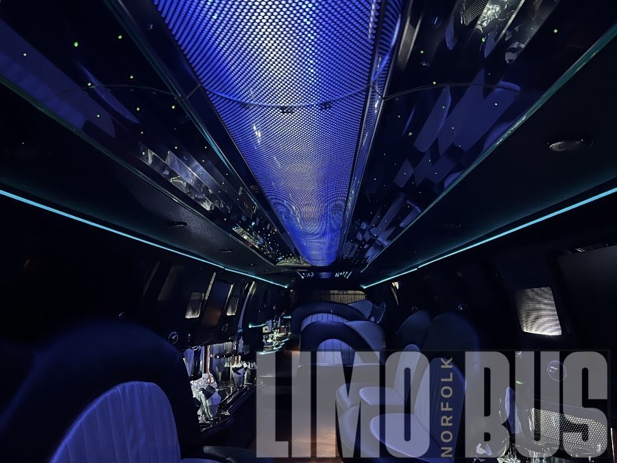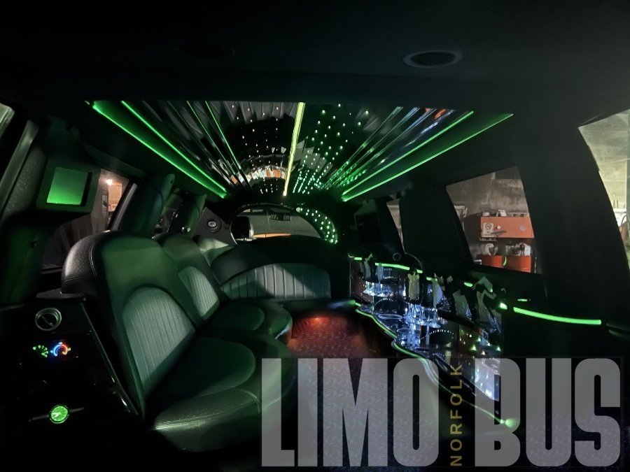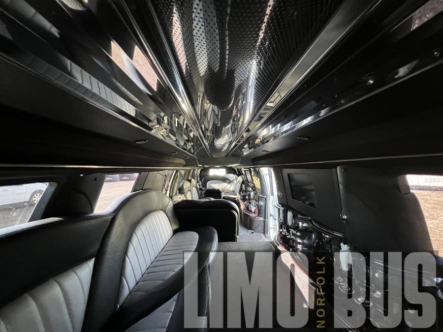 Make a powerful impression with our 14-passenger black SUV limousine—where bold styling meets first-class comfort. Featuring a sleek black exterior, fiber optic star ceiling, plush surround seating, and customizable LED lighting, this limo is designed for upscale nights out, weddings, corporate travel, and special celebrations across Norfolk. Inside, enjoy a spacious lounge-style cabin complete with a premium bar setup and luxurious atmosphere, delivering an unforgettable VIP experience.