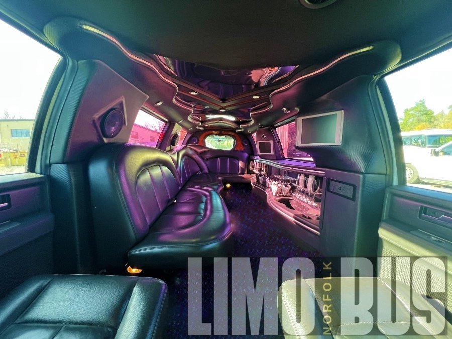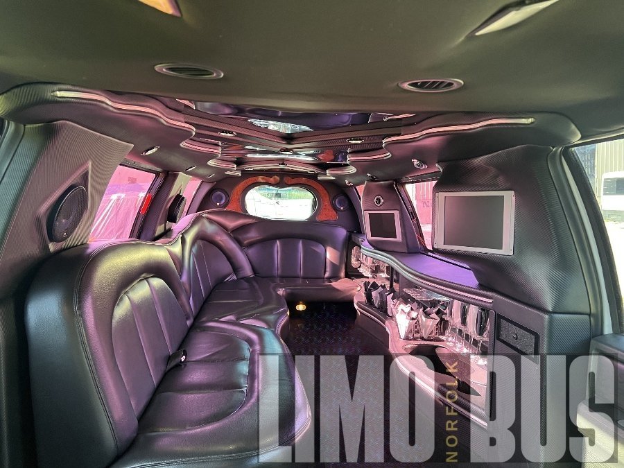 Step into a world of refined luxury with our 14-passenger white SUV stretch limousine. Designed for weddings, proms, corporate events, and special occasions across Norfolk, this limo offers premium black leather seating, ambient lighting, dual TV screens, and a sleek full-service bar. With its polished style and spacious comfort, every ride feels like a VIP experience.